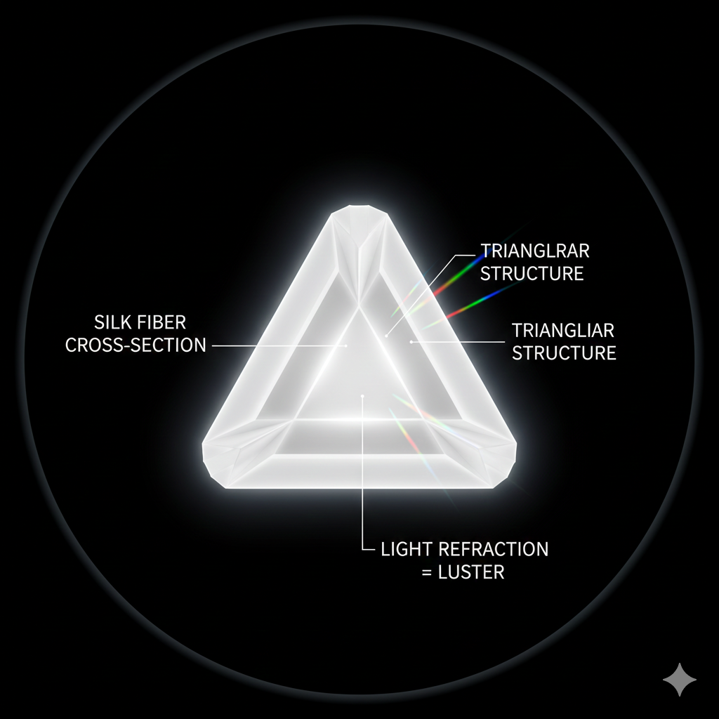 Silk fibers have a triangular structure that refracts light uniquely, creating that lustrous shine. Under microscope magnification, you can see the three-dimensional triangular cross-section of each fiber. This geometric structure: